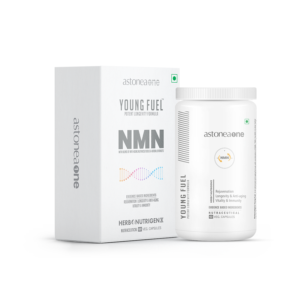 As we age, NAD+ (responsible for key cellular functions) levels naturally decline, leading to various age-related health issues. Herbonutrigenx Young Fuel has emerged as a promising approach to counteract these declines. It is an advanced anti-aging formula with a combination of NMN, Omega&rsquos, TMG, Ca-AKG, & other herbal extracts, & strong antioxidants like coQ10, trans-resveratrol, and glutathione which are known to reduce oxidative stress & promote longevity. Ca-AKG (calcium alpha-ketoglutarate) used in the formulation mitigates biological aging up to several years. In animal studies, &beta-NMN supplementation has been shown to increase NAD concentrations, improving health span and lifespan with great safety. It also supports skin rejuvenation, optimal metabolic, brain function & vitality.